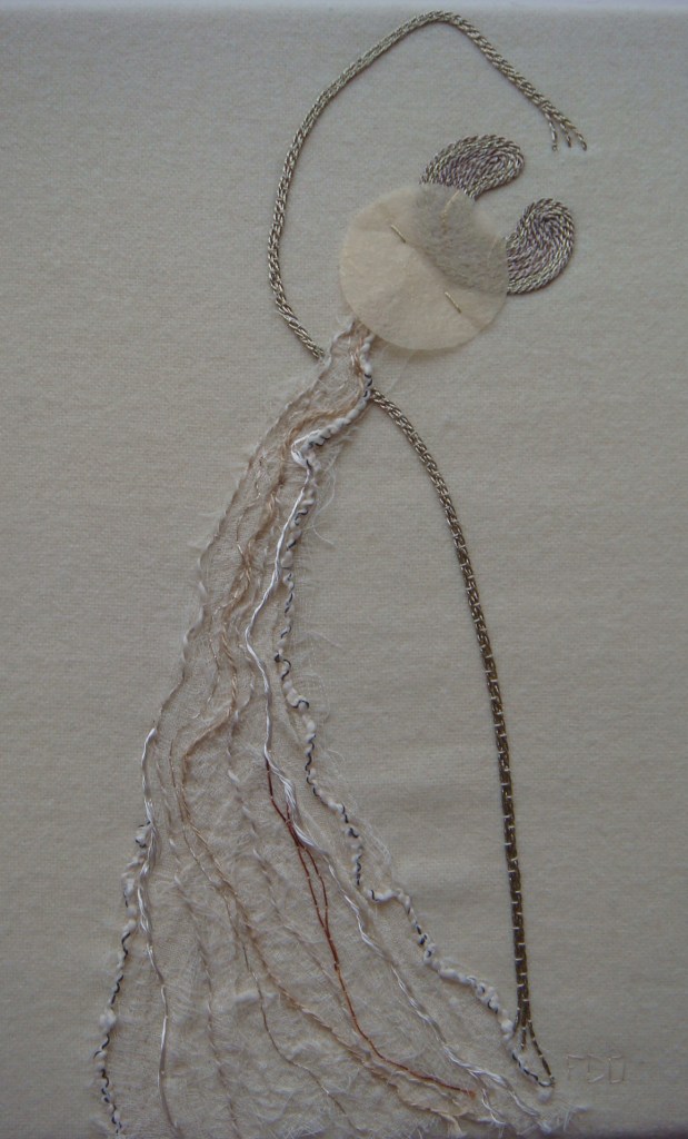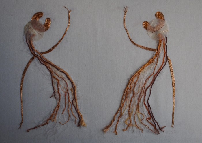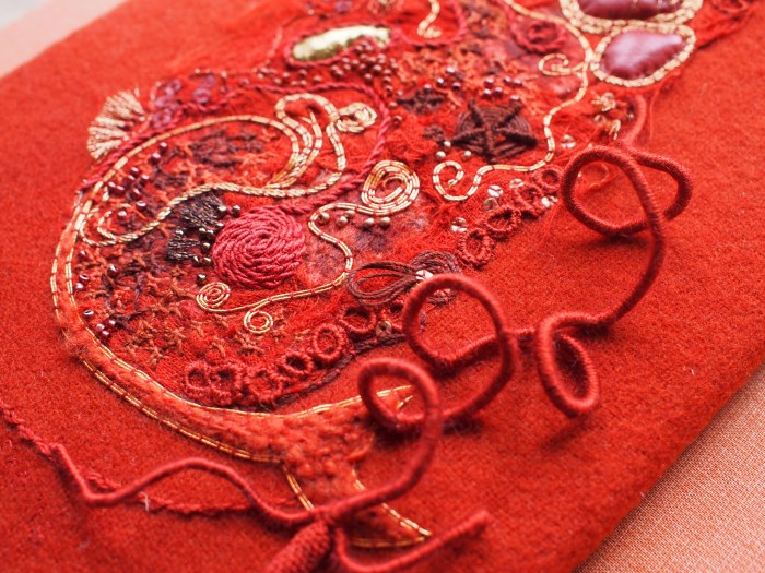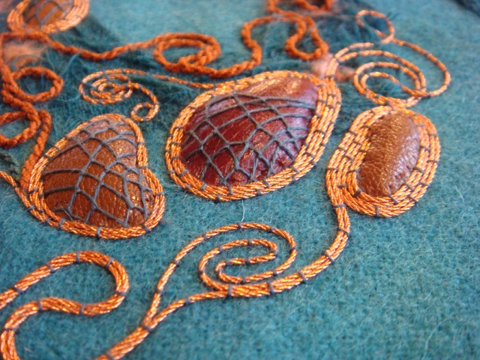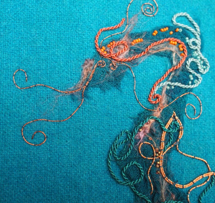 These selected images show wool gauze felted into the woolen flannel background embellished with metal threads, beads and stitching. A technique I really enjoy.