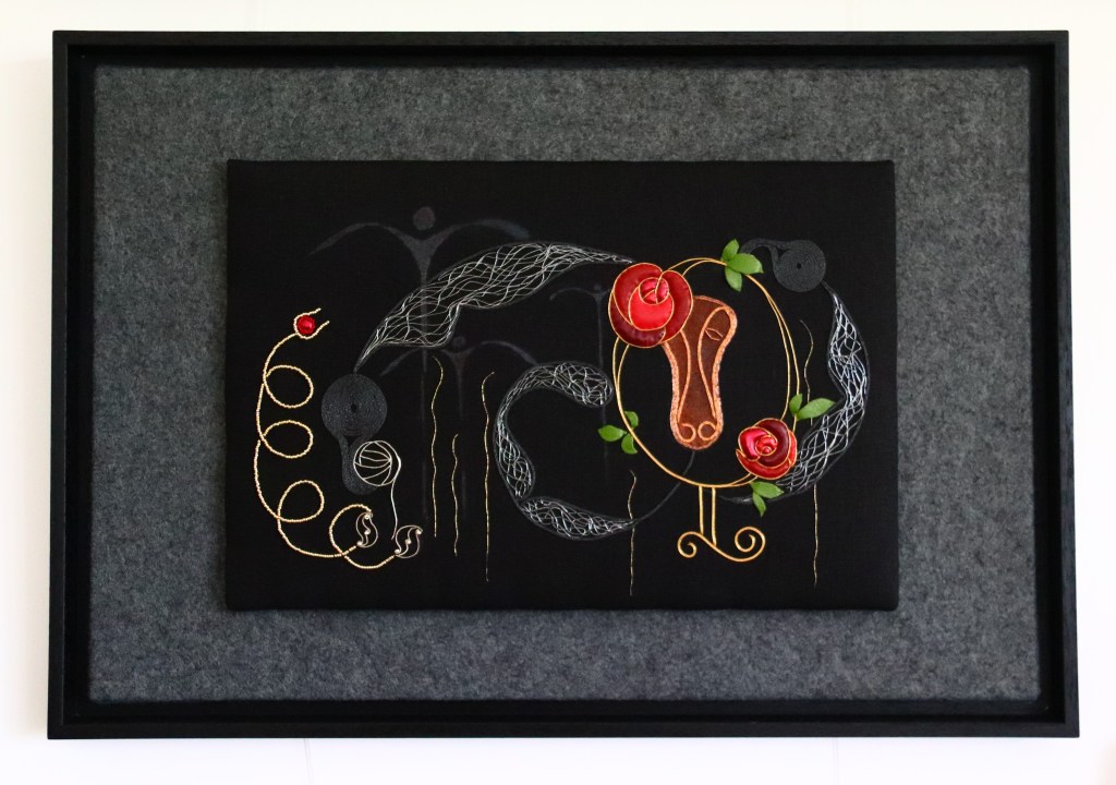 This piece layers Celtic images from the Iron Age upwards drawn from the Battersea Shield (350 – 50 BC), the Wandsworth Shield (300 – 200 BC), the Stanwick Horse Mask (AD 40 – 80), a Sword Scabbard Terminal (AD 50-150), the Hunterston Broach (AD 650-750), the English Tile Collection (c1900) and a Rennie MacIntosh stylised Rose (circa 1900).