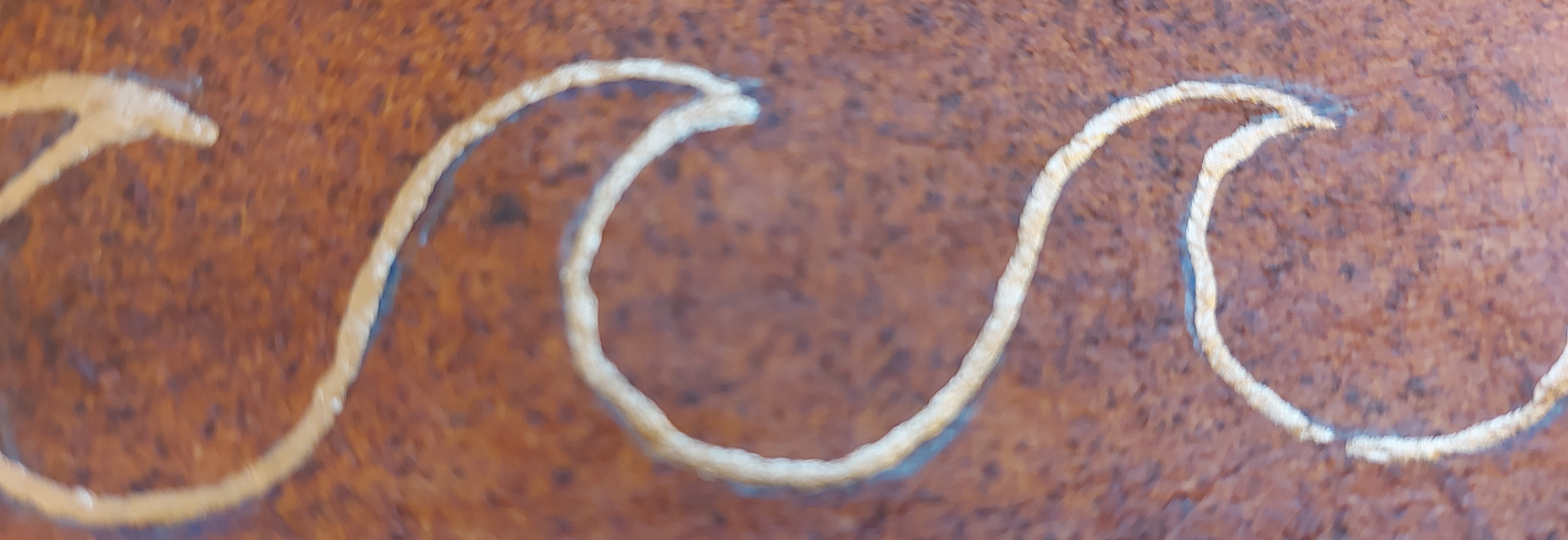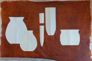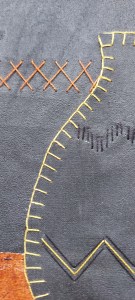 The background is “faux leather” made by bonding tissue paper onto muslin to give it wet strength and painted.