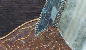 Black even weave cotton background with organza layers. Metal thread hand stitching with couching and running stitches.