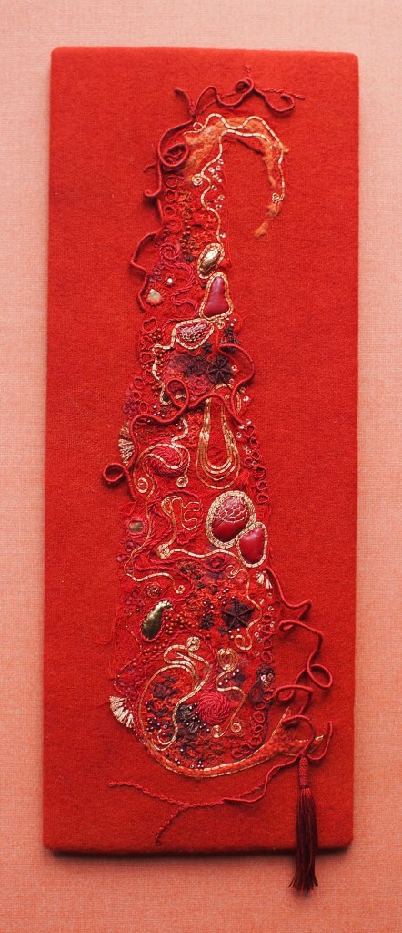 “Boteh in Red with Tassel” takes inspiration from the Norwich Shawl collection at the Castle Museum. On a wool flannel background I’ve needle felted in wool gauze and embroidered with copper and silk threads.
