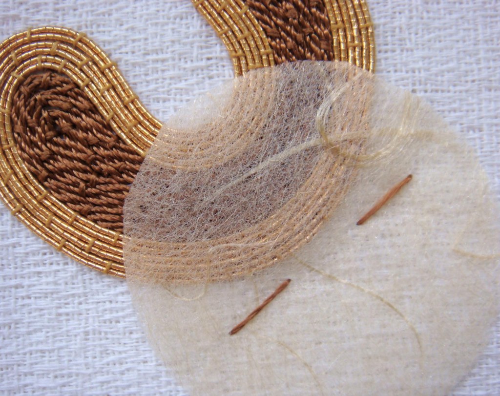 Whilst working towards my City & Guilds a gauntlet was thrown down suggesting that I would not have the patience to take on the details of “Gold Work”. I naturally accepted the challenge and am so glad that I did. Using metallic threads, leather pieces, beads, chippings, spangles and other items I am really enjoying designing and creating both detailed and loose contemporary pieces.